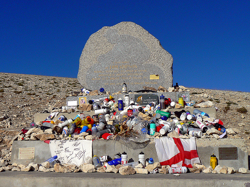 In 1967 Britain’s Tom Simpson famously died whilst competing in the Tour de France, keeling over on the slopes of Mont Ventoux – the ‘Giant of Provence’. At the approach to the summit of this great climb stands a monument to Simpson, and cycling tradition dictates that a token (a water bottle or a cap, for example) be left as a show of respect on the way past.